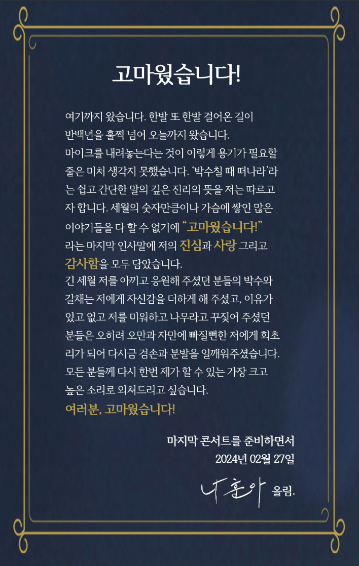 "세월의 숫자만큼이나 가슴에 쌓인 많은 이야기들을 다 할 수 없기에 '고마웠습니다!' 라는 마지막 인사말에 저의 진심과 사랑 그리고 감사함을 모두 담았습니다." 라고 편지를 마무리 했다.